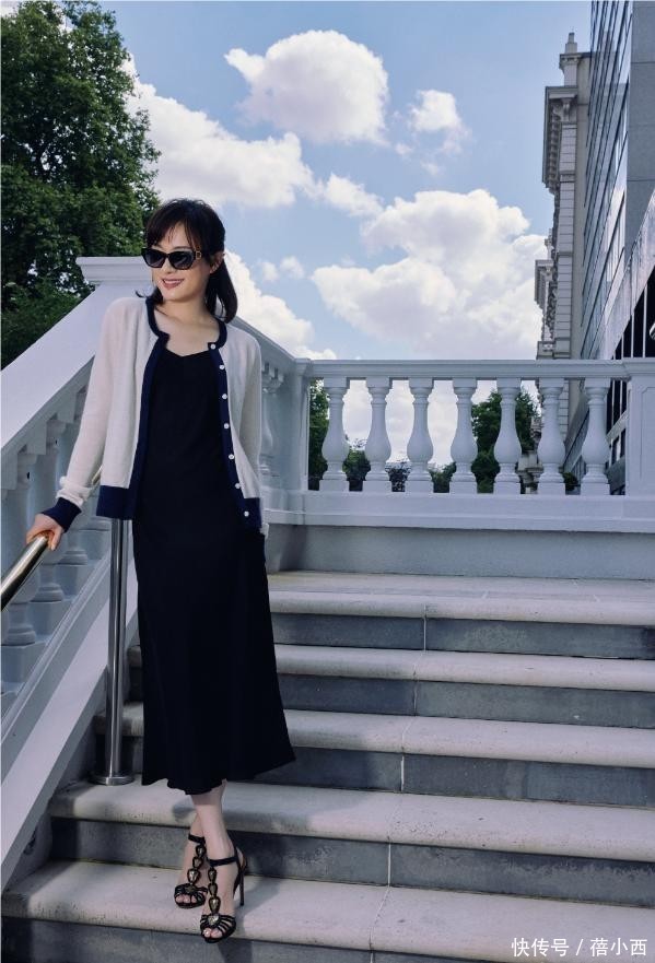小开衫里层搭了一件黑色连衣裙,这款裙子面料光滑,看着就超级有质感。黑裙的领口不小,脖子与胸部之上的肌肤都能尽收眼底,但视觉上又不会让人觉得暴露,所以,此种露肤度刚刚好。因此,夏天穿这种领子的连衣裙会十分舒服、凉快。